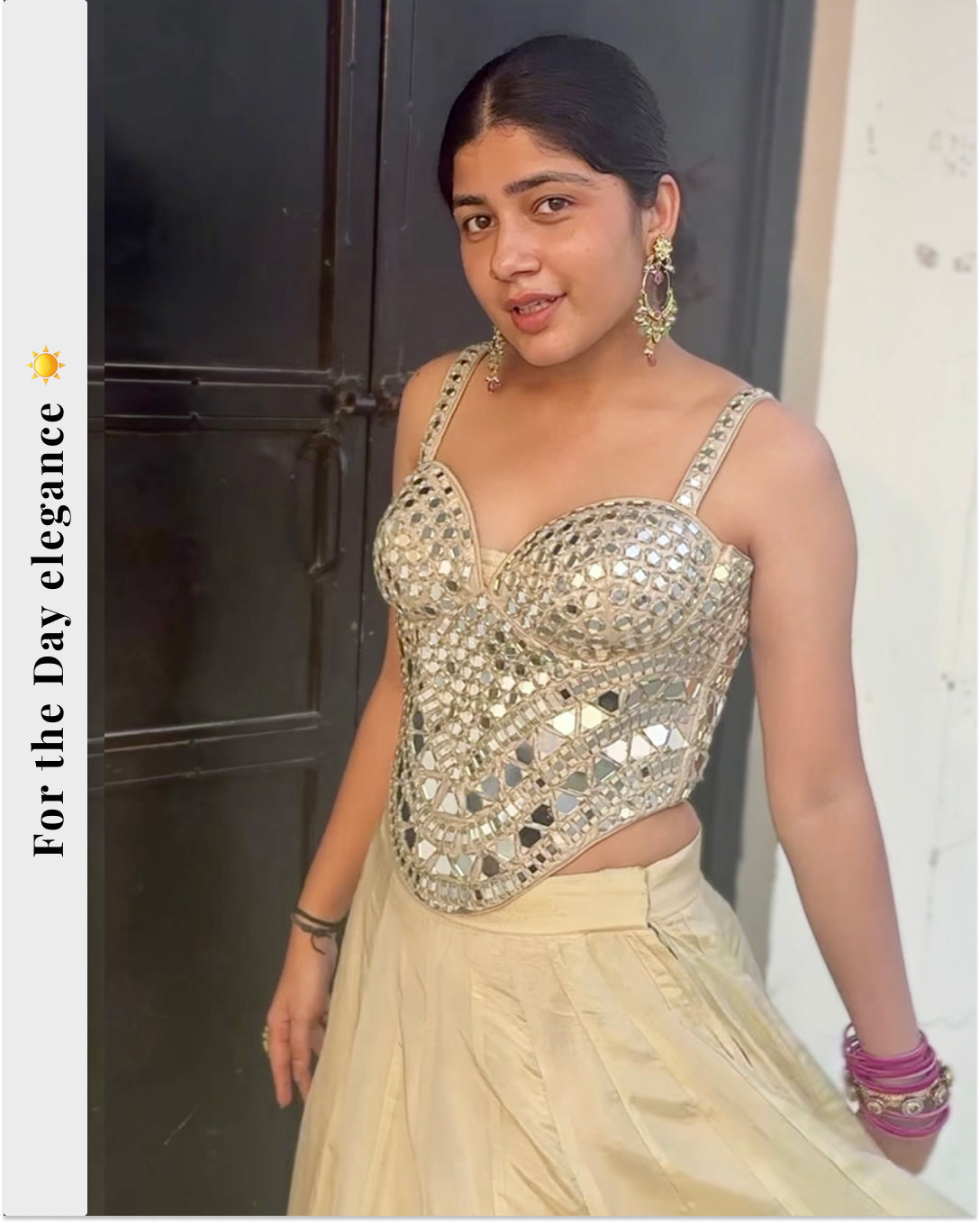A statement-making mirrorwork corset that transforms any outfit — from classic lehengas to tailored pants or draped skirts. Handcrafted with intricate mirror embroidery and structured for a flattering fit, it’s your go-to piece for both day festivities and night glamour.